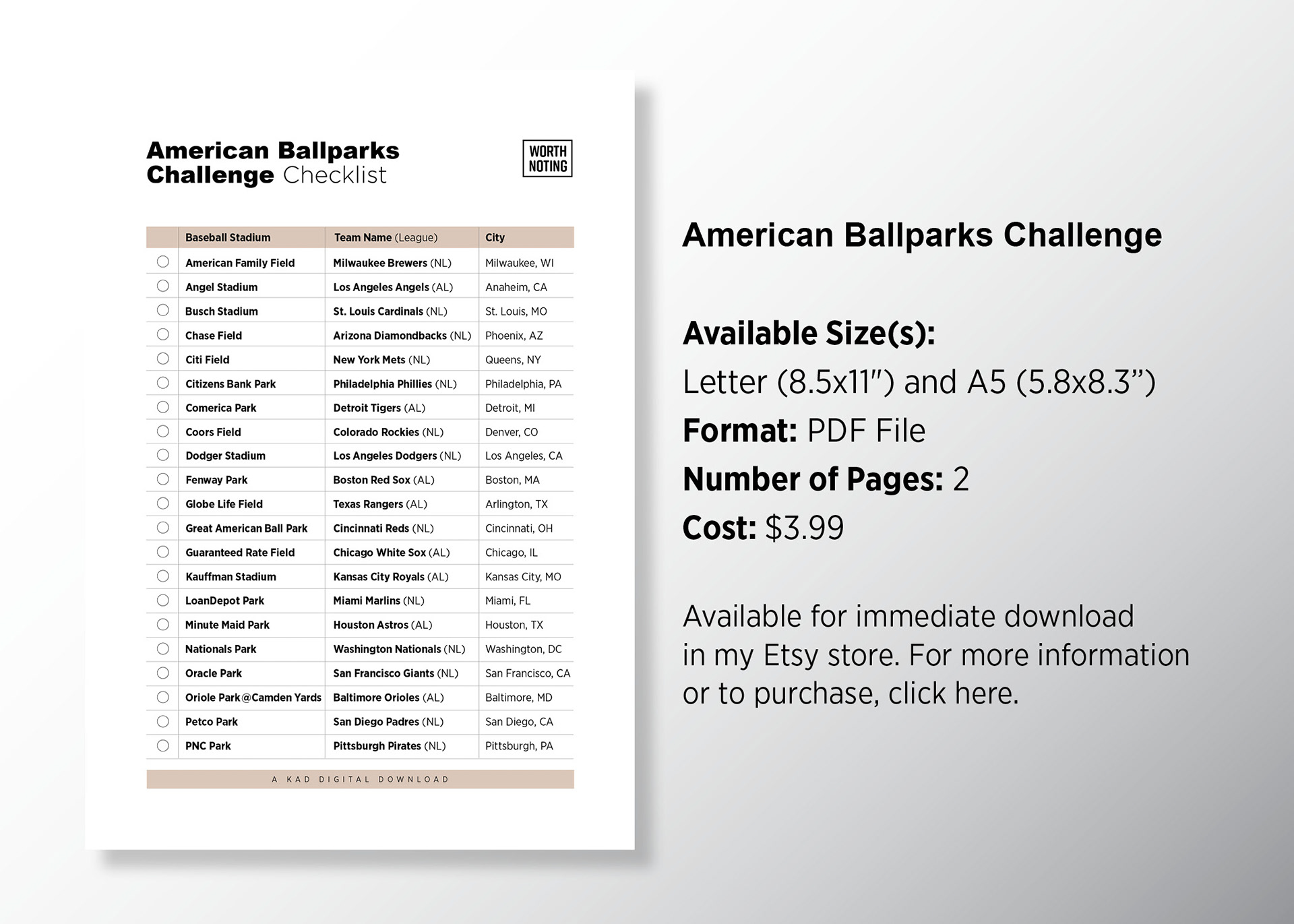 AMERICAN BALLPARK CHALLENGE: Those who love baseball make it a lifetime goal to visit each of the Major League Baseball Stadiums in America. If you are one of them, this checklist is for you. It lists the stadiums for the 30 MLB teams in the American and National Leagues. Info | Purchase